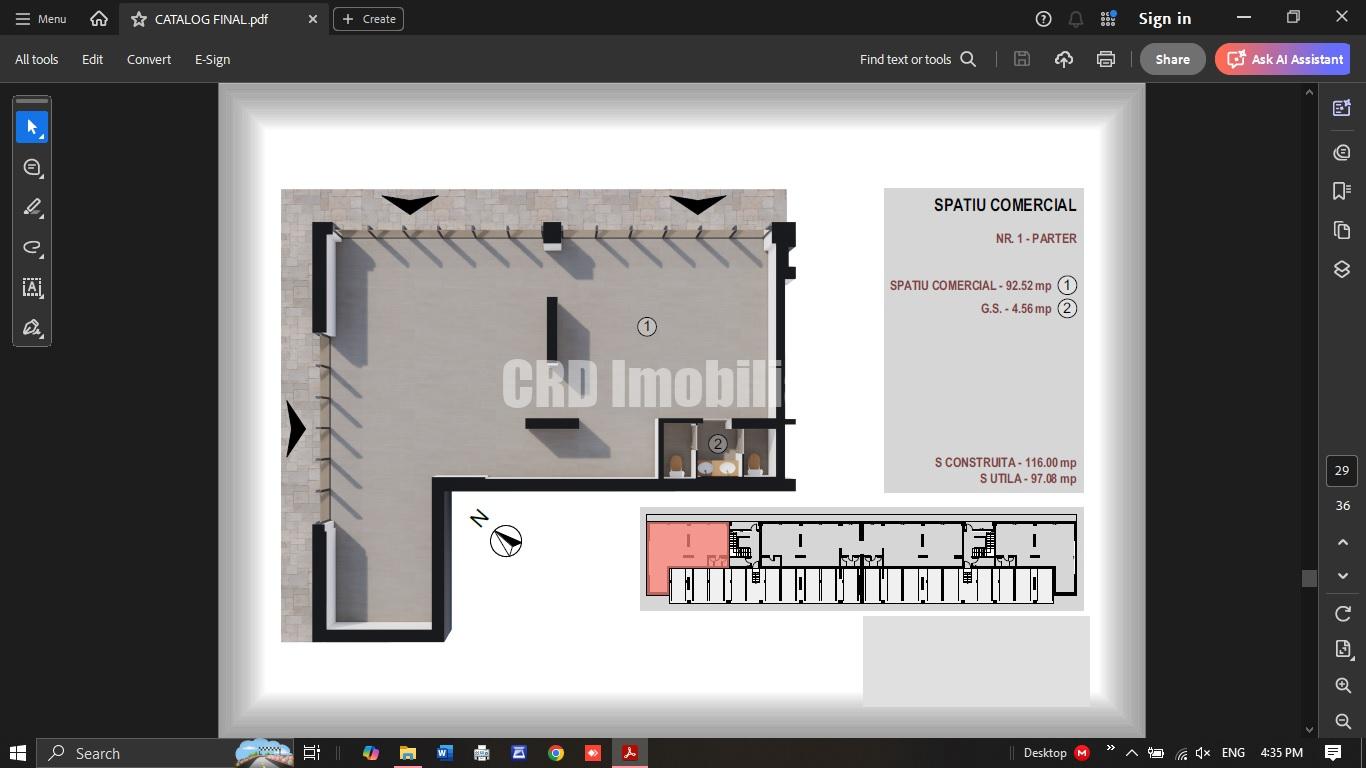 1. Spatiu in suprafata construita de 116 mp si utila de 97 mp, dispune de grup sanitar propriu (dublu) si forma permite compartimentarea dorita;