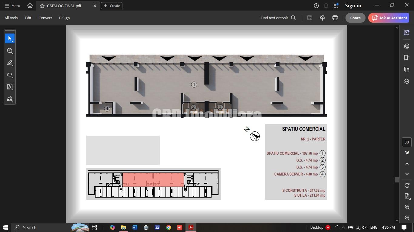 2. Spatiu in suprafata construita de 247,3 mp si utila 211,7 mp, dispune de 2 puncte sanitare si poate fi compartimentat dupa preferinte;