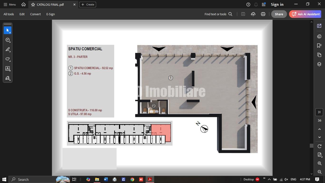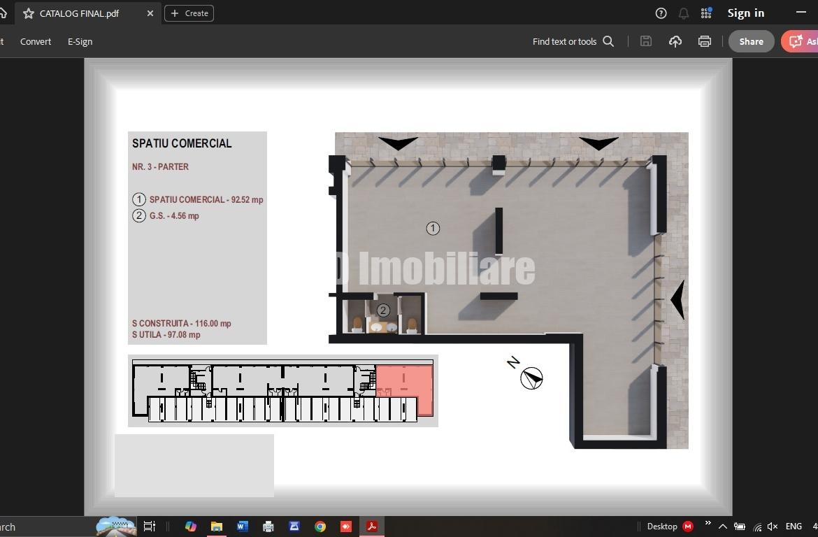 3. Spatiu in suprafata construita de 116 mp si utila de 97 mp, dispune de grup sanitar propriu (dublu) si forma permite compartimentarea dorita.